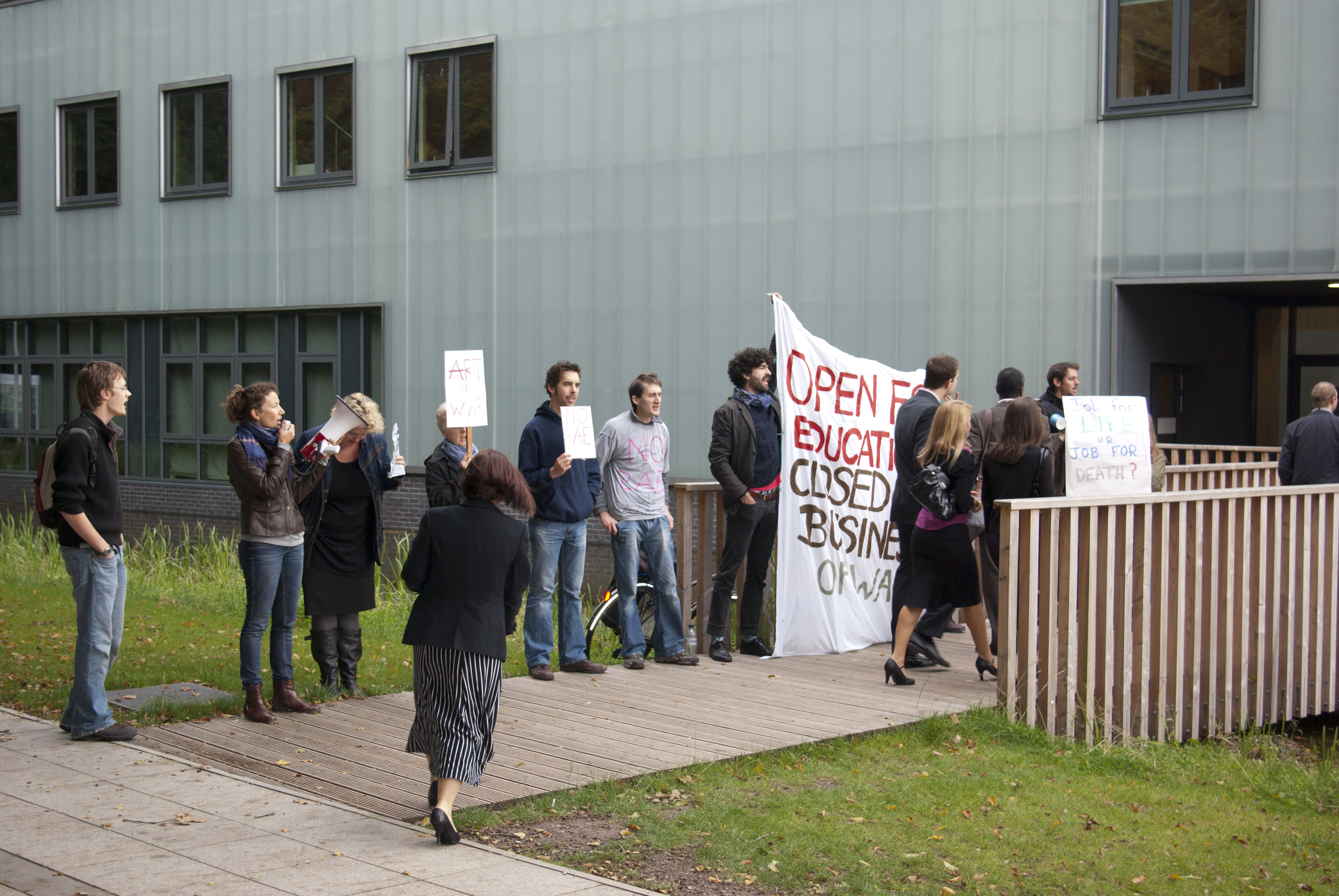 At the time of the protest, CAAT (Campaign Against Arms Trade) declared that the protest was the beginning of a sustained campaign against the University’s investment in BAE. The group were unhappy at the university’s decision to offer a ‘BAE Systems Certificate in Management’ from the Lancaster University Management School.