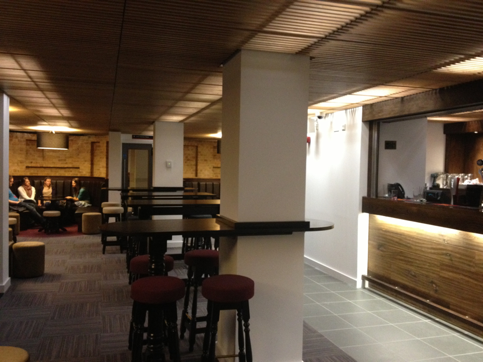Its’ understated pleasantness is often interrupted by areas that scream ‘university building’. Parts of the walls are white. Not old stony white. A colour chart might describe it as ‘prospectus white’. The doors leading into the bar, the back bar and the JCR are solid grey and bear the generic room labels found everywhere else on campus.