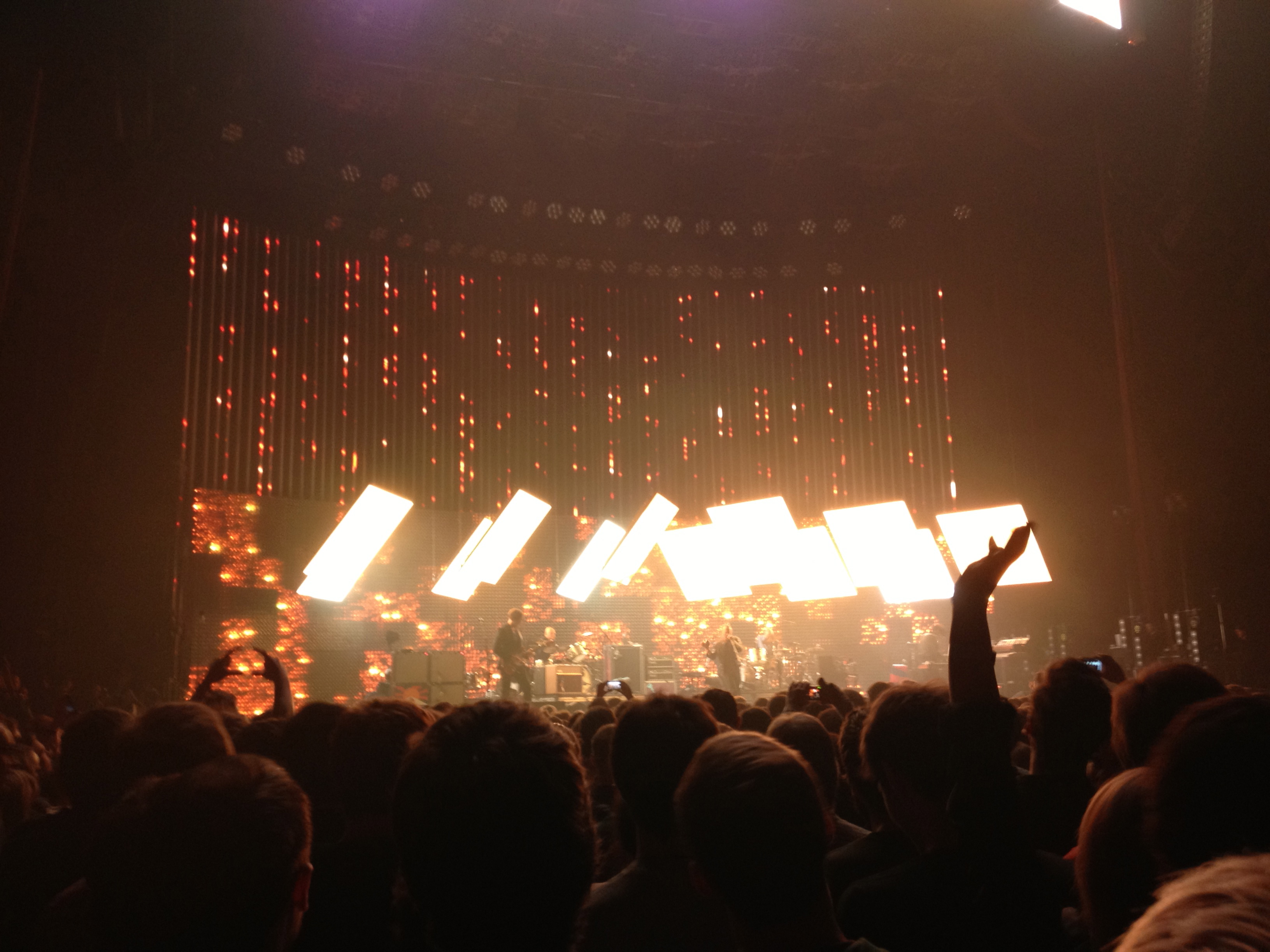 The stage set was as electric as the music. The entire front wall of the arena was dominated by an awesome screen of colour changing light. Suspended above were moving, tilting square screens that would show nothing but close-ups of the instruments being played and QR codes in-between songs.