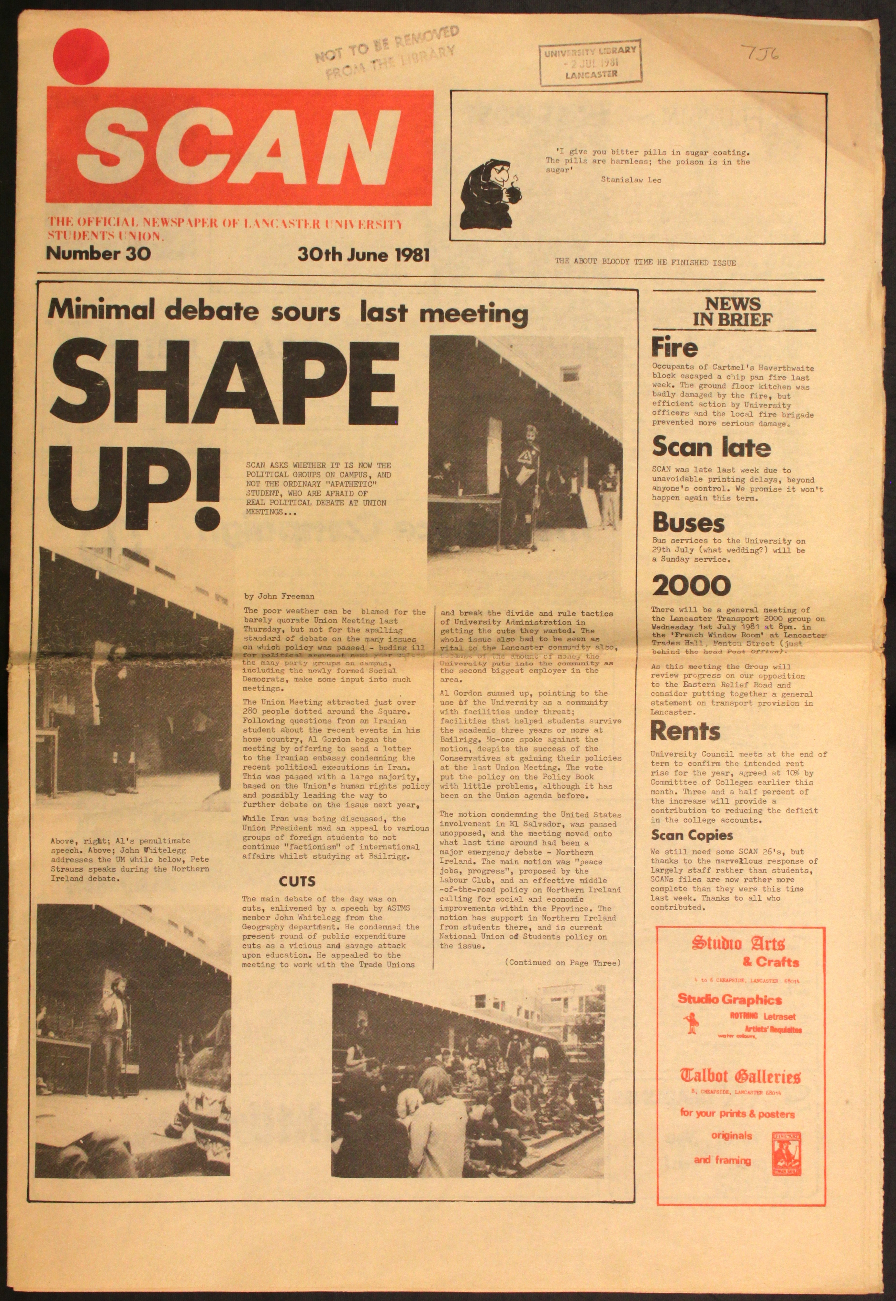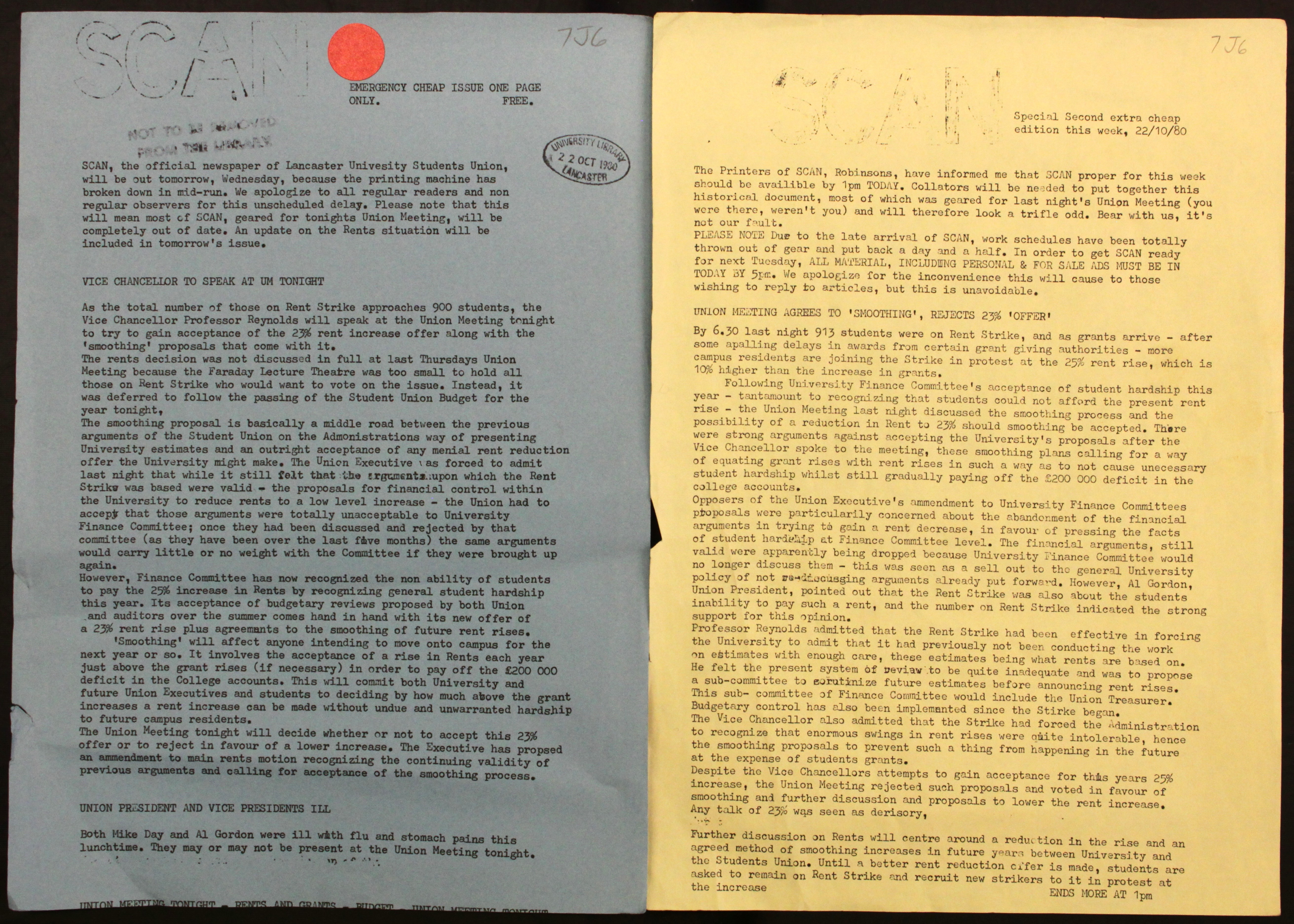 Over the last 50 years SCAN has been engaged in reporting student comment and news during which it has been a front-runner for student politics and change. Like the University the paper has changed dramatically since its founding – evolving from a typewritten pamphlet in 1967 into a full-blown 64-page broadsheet by 2013. This article picks out 50 of the most noteworthy stories from the University’s rich history and is in dedication to Marion McClintock who has kept our University archives in proper and correct condition since joining Lancaster in 1968. I also personally thank her for accommodating me so kindly as I sifted through countless issues of University news. There are some real crackers in this lot, so I hope you enjoy reading them as much as I did.