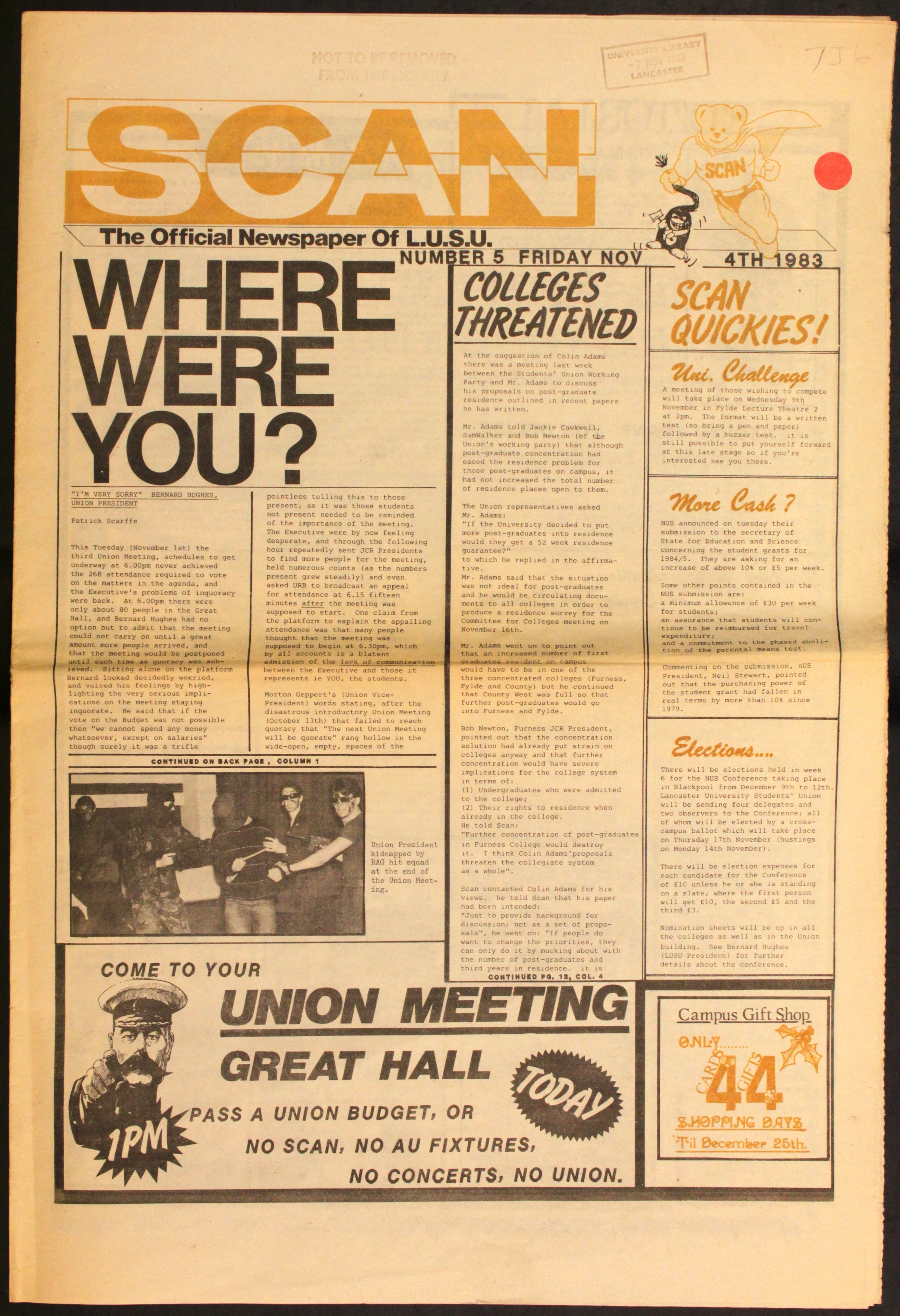 1982 – Mini crime spree reported on campus as £70 (£230 in today’s money) is stolen from Cartmel residents and £150 (£460) from County. A vicious attack was also made on a rubber plant in Lonsdale.
